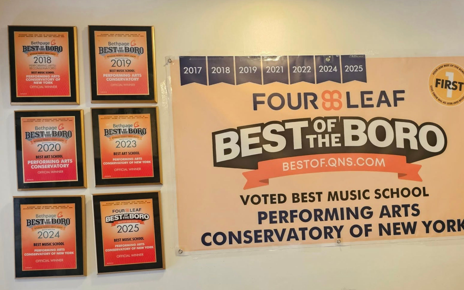 Desde sus inicios, Performing Arts Conservatory of New York ha mantenido un compromiso firme con la excelencia educativa. Gracias a la visión de Teresa Durán y su liderazgo constante, la escuela ha recibido múltiples reconocimientos, entre ellos nueve años consecutivos como “Mejor escuela de música en Queens”, otorgados por The Best of the Boro. Este logro refleja el cariño y la confianza que la comunidad deposita en la institución.